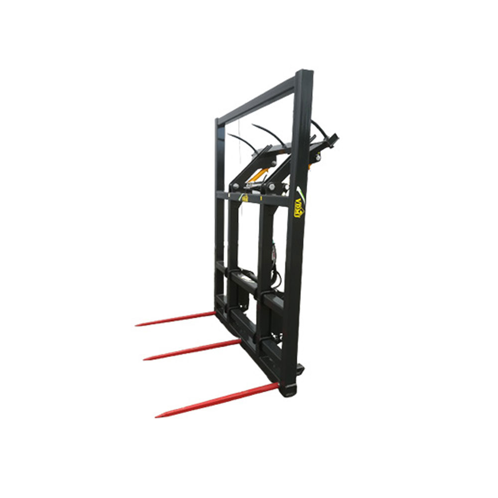 The STBK is an extremely robust straw fork that is typically used on heavy articulated loaders, front loaders, bulldozers and telehandlers. The outer tines of the bale spike are centered at 1.50m distance. An additional hydraulic clamping device at the top of the frame allows the transportation of 4 large bales in no time and at high speed. An additional advantage is that the attachment is screwed on, which makes it easy to change it afterwards within 10 minutes.