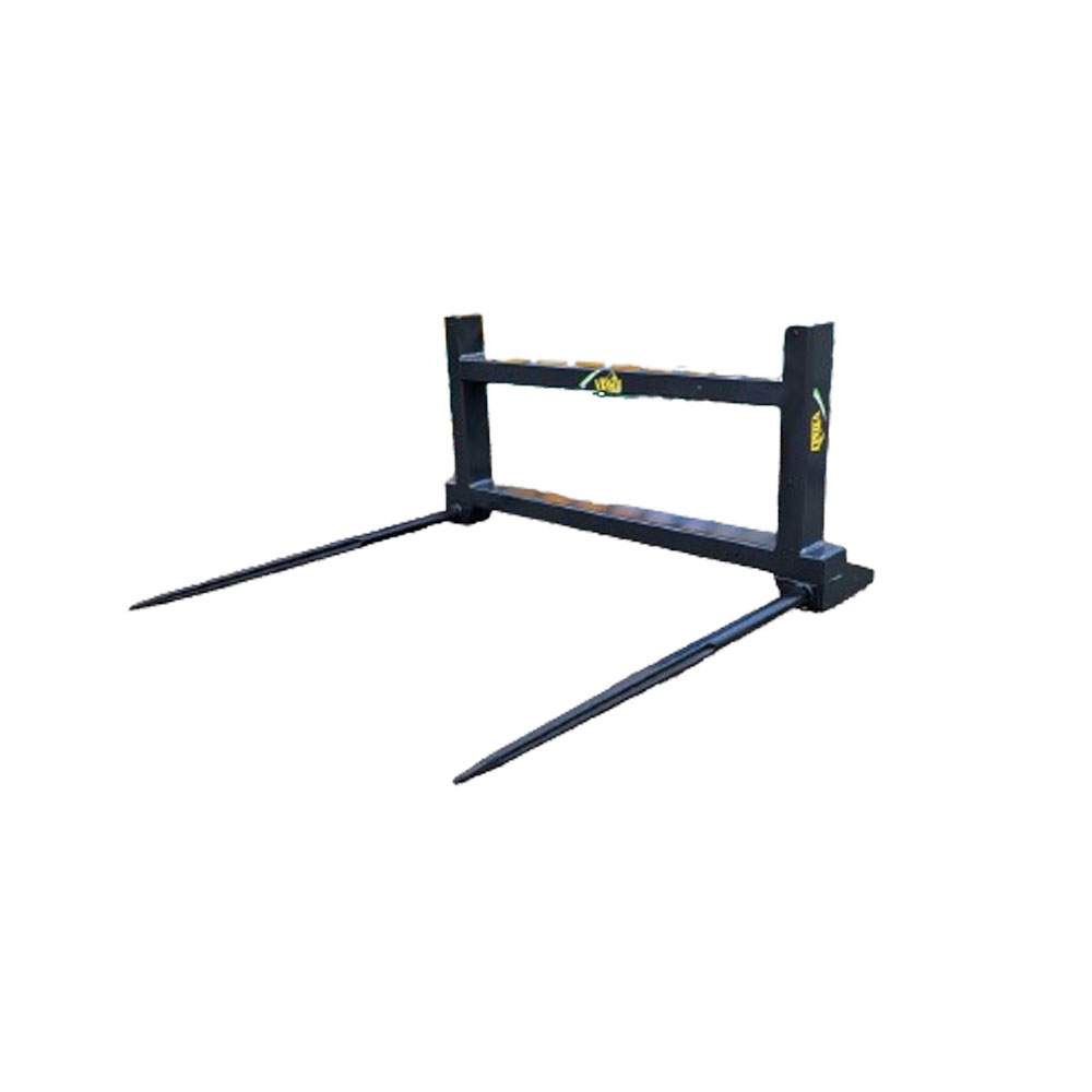 The STK-1 is a bale fork typically used on articulated and skid-steer loaders when loading one bale. The bale fork has two tines that are centre-centre at 1.10m. The attachment can be bolted on, making it easy to adjust the straw fork when changing to another loader (with a different hitch system).