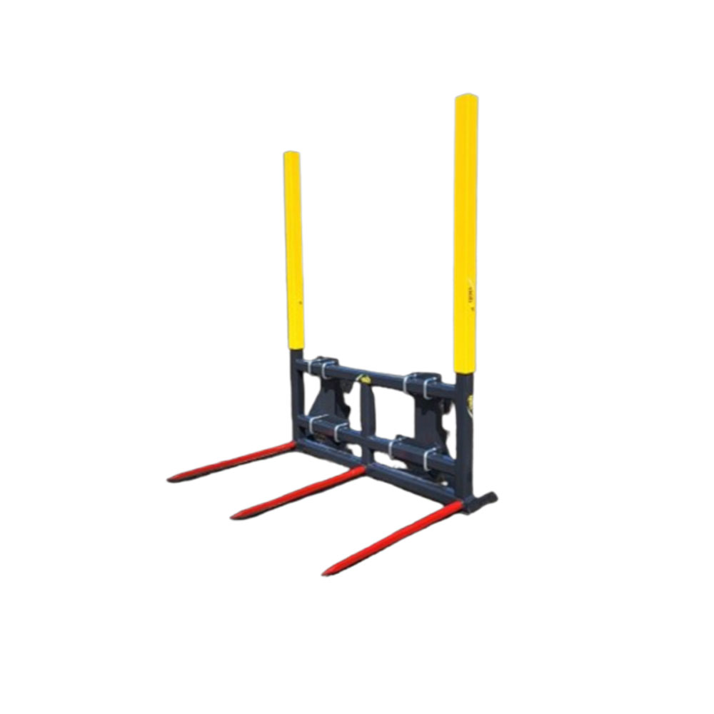 The STK-4 is an extremely robust straw fork that is typically used on heavy articulated loaders, front loaders, bulldozers and telehandlers. The outer tines of the bale spike are centered at 1.50m distance. The top of the frame consists of 2 removable tubes. These can be placed either in a high position, or in a low position, or even completely removed (useful when stacking under a ceiling). An additional advantage is that the attachment is screwed down, which makes it easy to change it afterwards within 10 minutes.